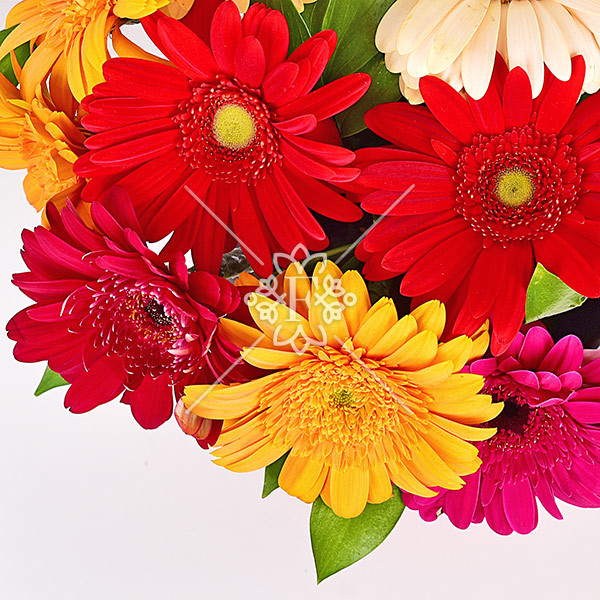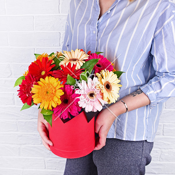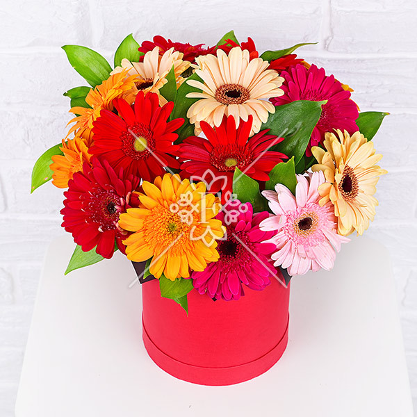 гербера разноцветная - 17 шт., зелень декоративная, оазис, коробка. Примерный размер: 25Х30 см.