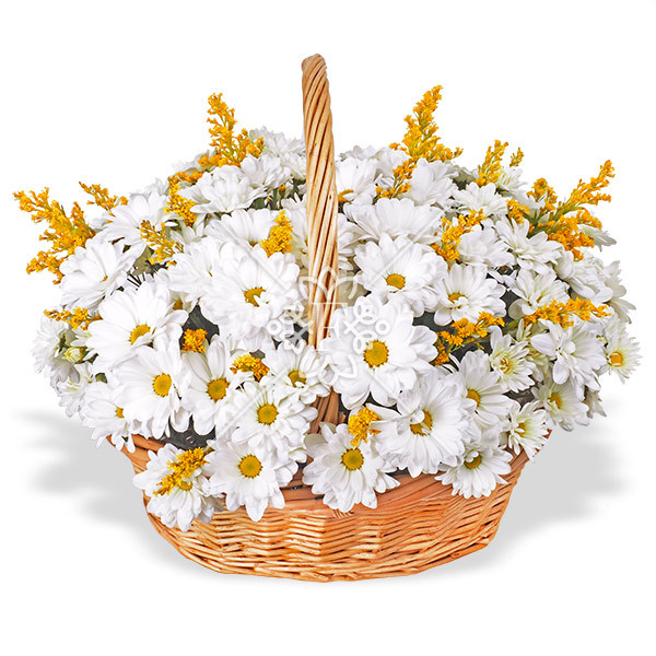 Очаровательные белоснежные хризантемы, словно легкое и пышное облако, уютно разместились в аккуратной плетеной корзине. Среди этого белого великолепия, солидаго напоминает блики солнечных лучей! Композиция проста и очень гармонична.