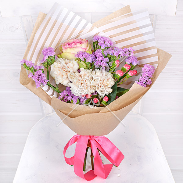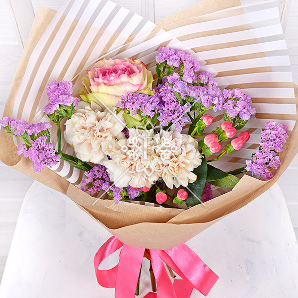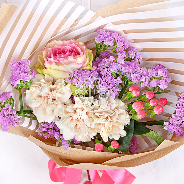 Роза розовая – 1 шт., гвоздика кремовая – 3 шт., гиперикум розовый -1 шт., статица светло-сиреневая – 1 шт., упаковка, лента.