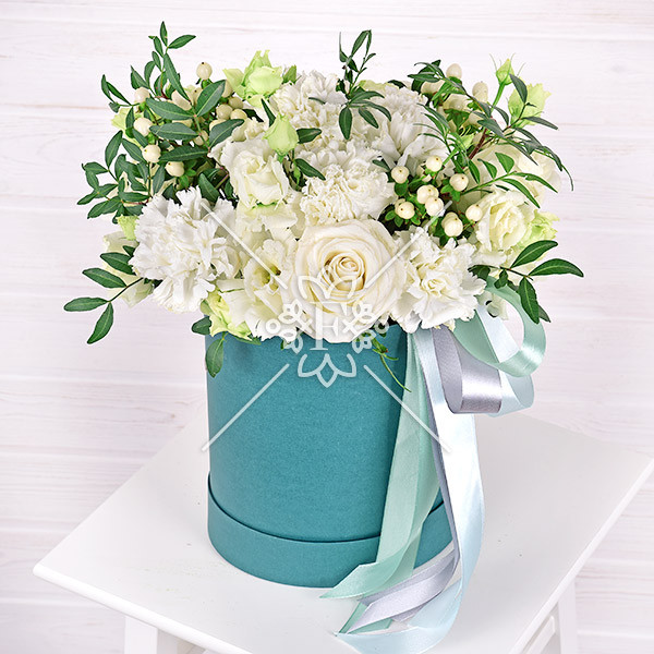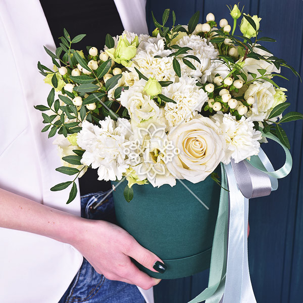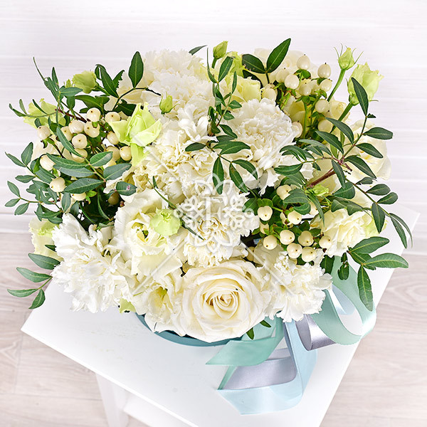 гвоздика белая – 9 шт., роза белая – 4 шт., эустома белая – 3 шт., гиперикум белый - 3 шт., зелень декоративная (фисташка), оазис, коробка, лента.